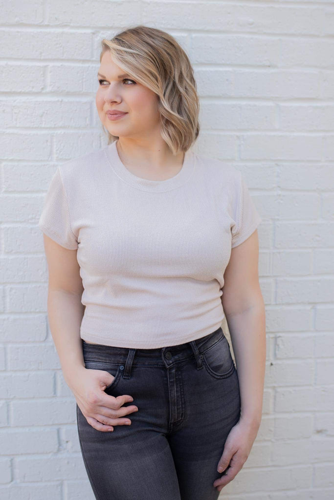 The perfect basic crop in the sweetest blush pink- with a super soft ribbed material- perfect for throwing on to runs errands or dressing it casual cute with some denim or shorts & sneakers!