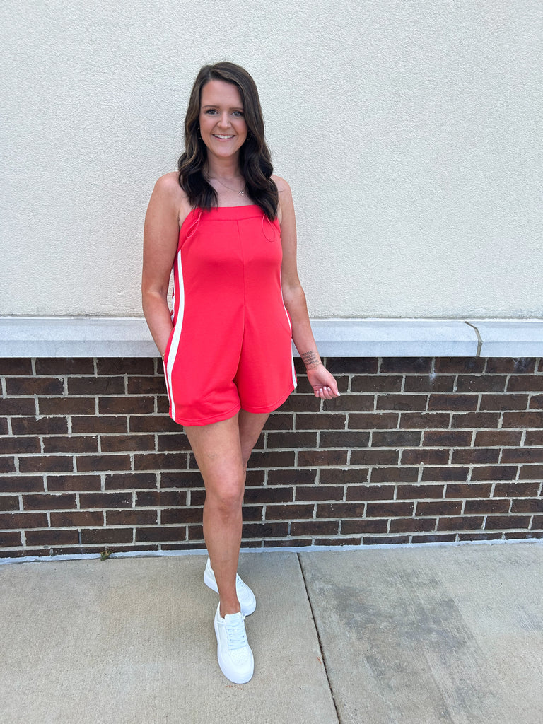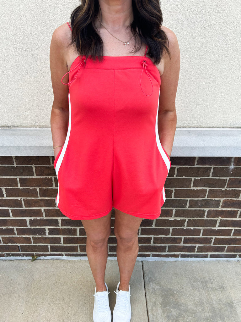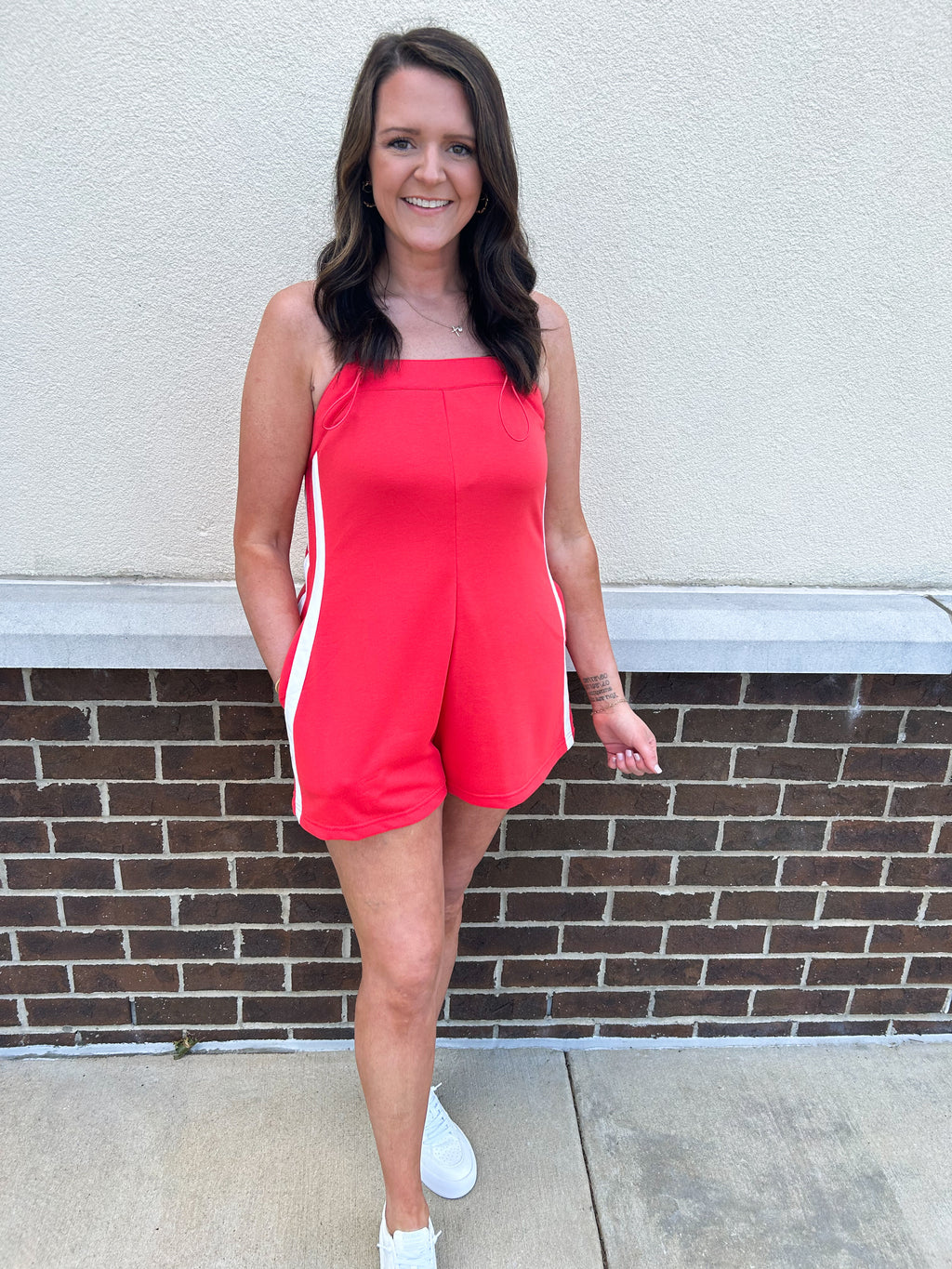 Athletic romper with a loose fit. Featuring adjustable straps and side striped detail.