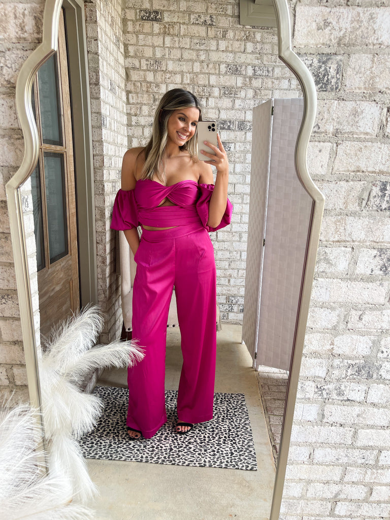 This set is everything you need to stand out! true fit, model is wearing a small pant & medium top!